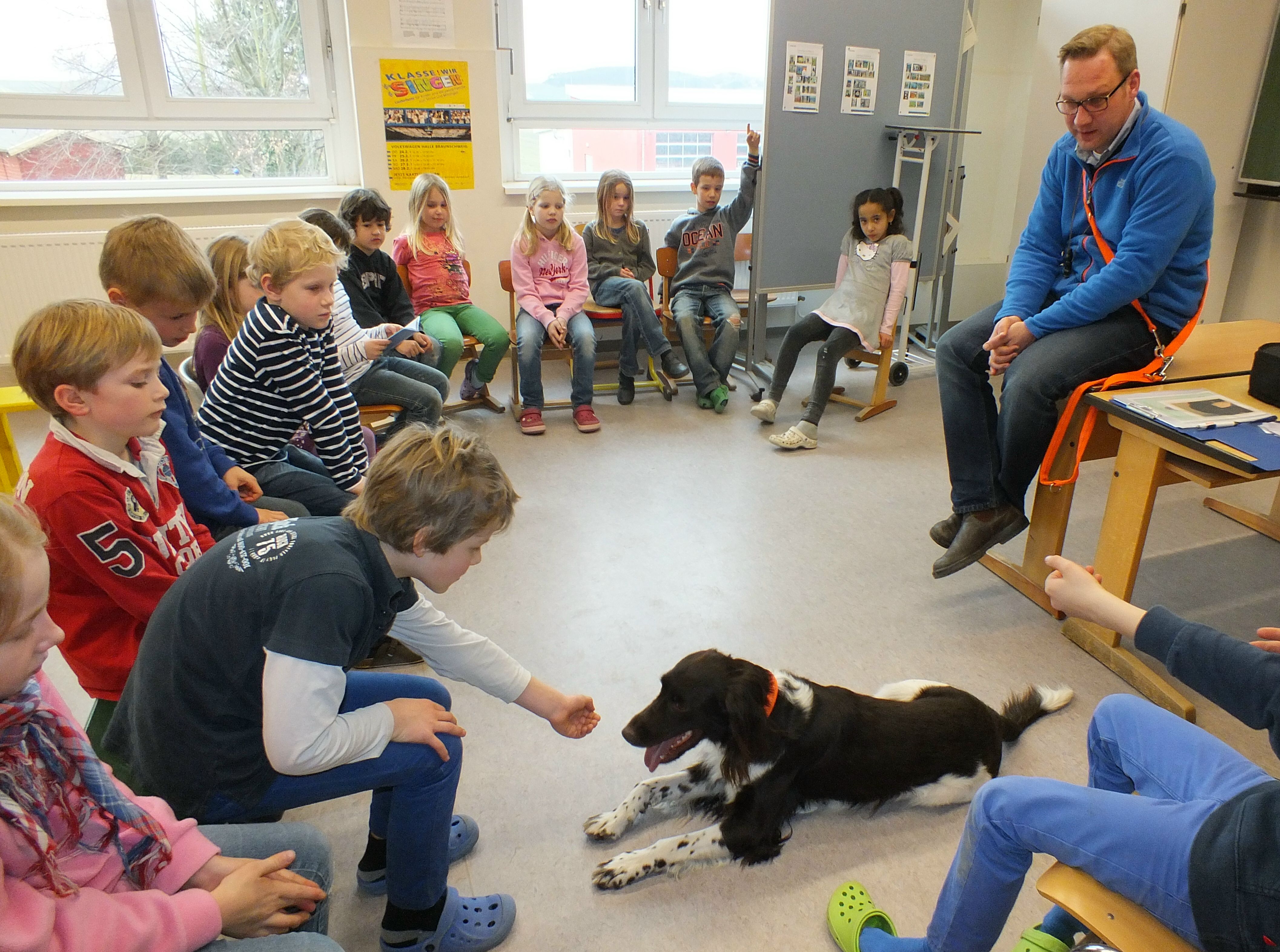 Als das Thema „Haustiere“ bzw. „Hunde“ ausführlich im Sachunterricht der Klasse 2 behandelt wurde, erklärten sich zwei Väter spontan bereit, mit ihren Hunden zu uns in die Schule kommen. Mit großem Hallo wurden so am 19.02.14 „Amigo“ (ein Parson Russel Terrier) und am 28.02.14 „Brando“ (ein Münsterländer) begrüßt. Die Schülerinnen und Schüler durften die Hunde streicheln, Fragen an die Besitzer stellen und auch Einsicht nehmen in die Dokumente zur Jagdhundausbildung.