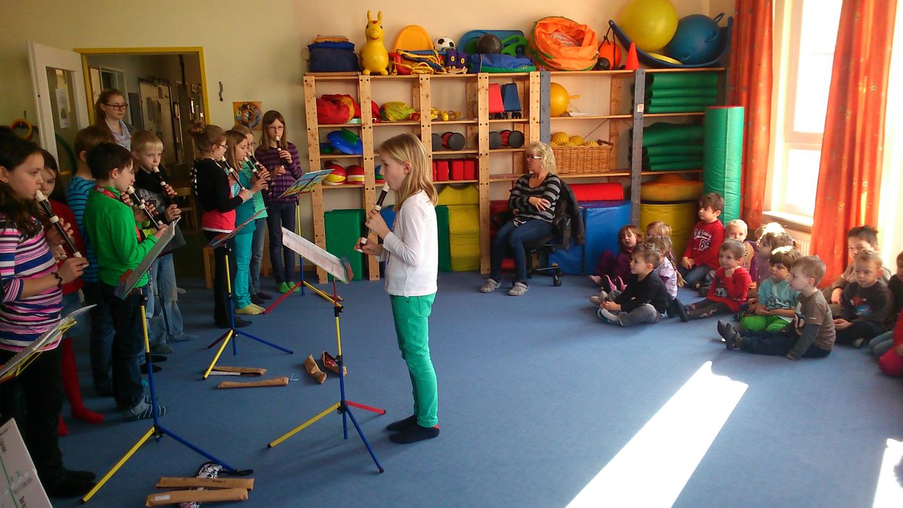 Die Klasse 3a der Grundschule Denkte hatte im Februar 2014 ein kleines musikalisches Programm vorbereitet, um die kommenden Schulkinder des Kindergartens Phantasia auf die musikalische Ausrichtung der Schulzeit vorzubereiten. Zu einem Playback flöteten die Schülerinnen und Schüler, angeleitet durch einen „Experten“, 6 Musikstücke, die sie jeweils mit einer kleinen Moderation ankündigten. Die „Bären“ hörten sehr aufmerksam zu und natürlich gab es zum Ausklang noch ein gemeinsames Lied. So funktioniert eine musikalische Brücke. Es hat einfach allen nur Spaß gemacht!