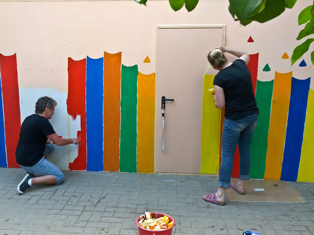 erstrahlt unsere zur Spielgeräteausgabe umgewandelte Garage. Mit Kreativität und Energie haben Frau Matecki und Frau Zurek die Gestaltung der Garagenwand vorgenommen. Wir freuen uns alle sehr über diese gelungene Verschönerung. So bunt muss es an einer Schule sein! Toll gemacht!