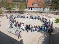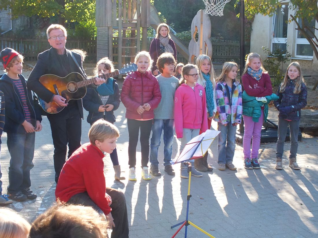 An jedem Freitag gibt es zur Zeit ein Treffen aller Schulkinder und Lehrer auf dem Hof. Gemeinsam wollen wir für das Liederfest "Klasse, wir singen!" im Juni üben. Am Freitag, dem 24. April, standen der gleichnamige "Titelsong" sowie "Zwei kleine Wölfe" auf dem Programm.