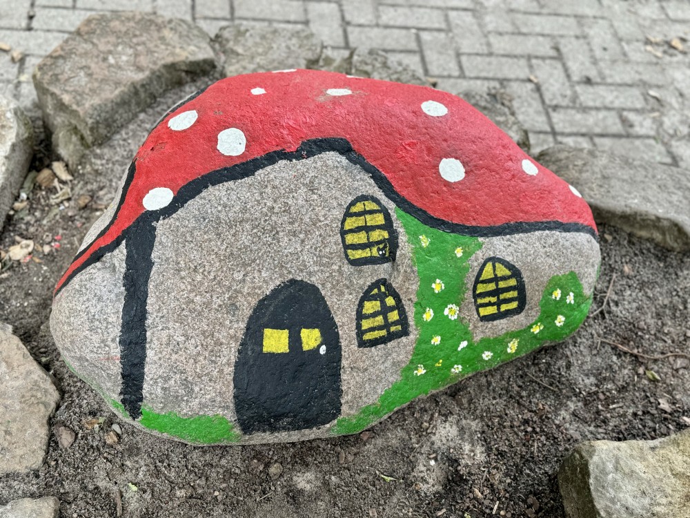 Mit ihrer Kreativ-AG hat unsere pädagogische Mitarbeiterin Frau Matecki die farblosen Steine auf dem Schulhof bunt gestaltet.