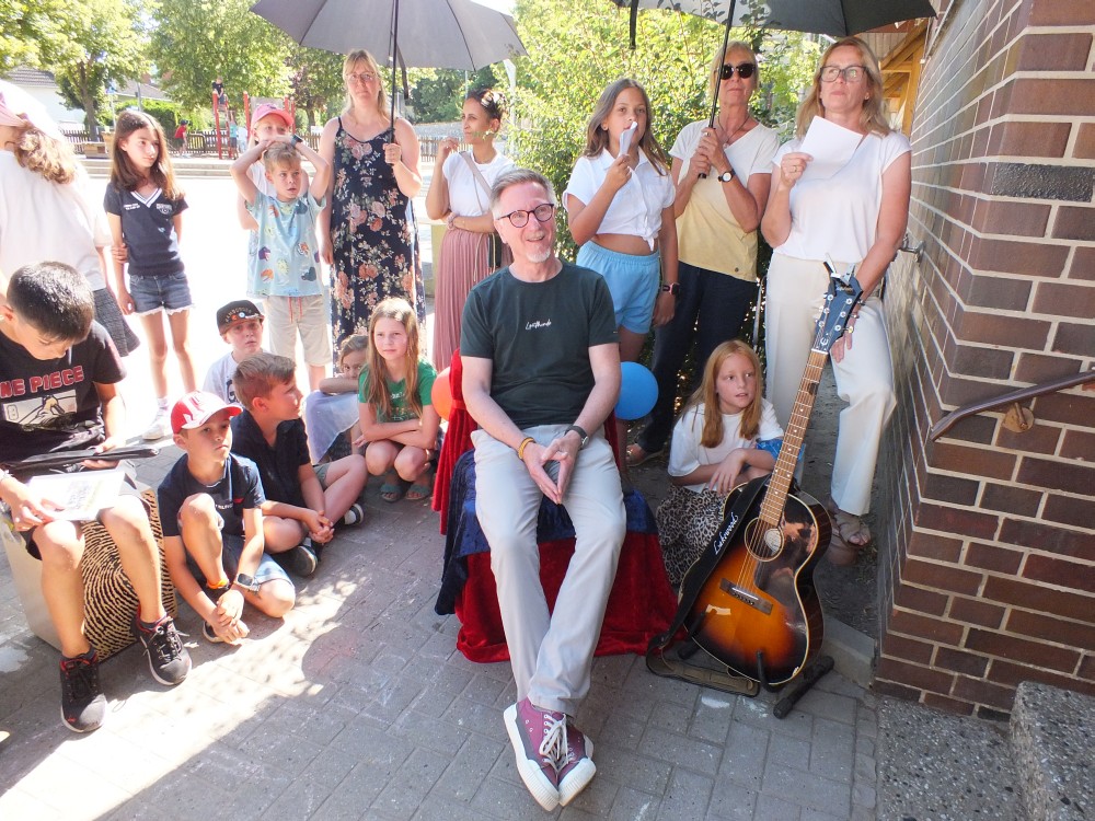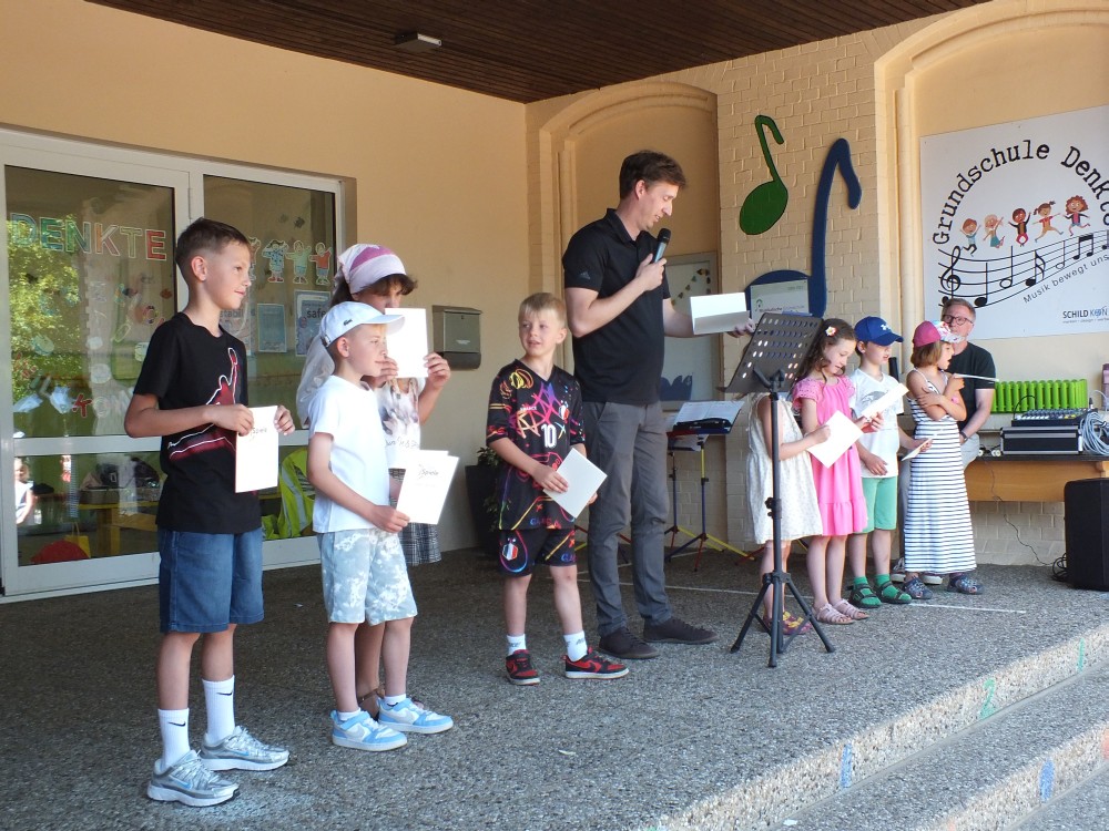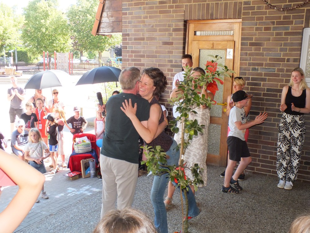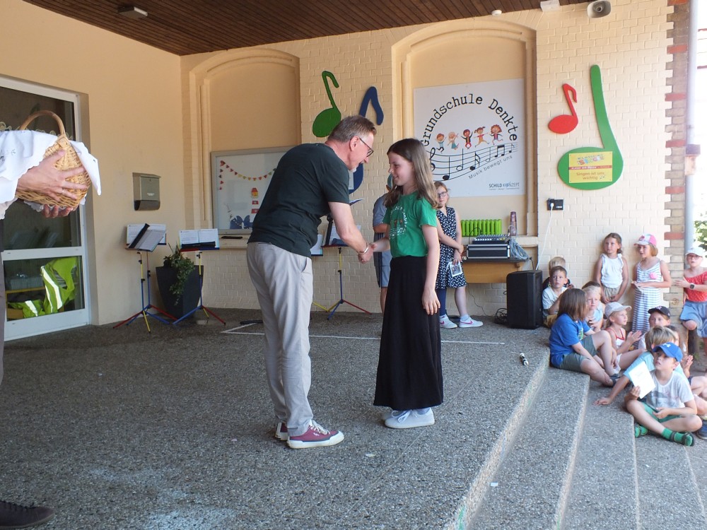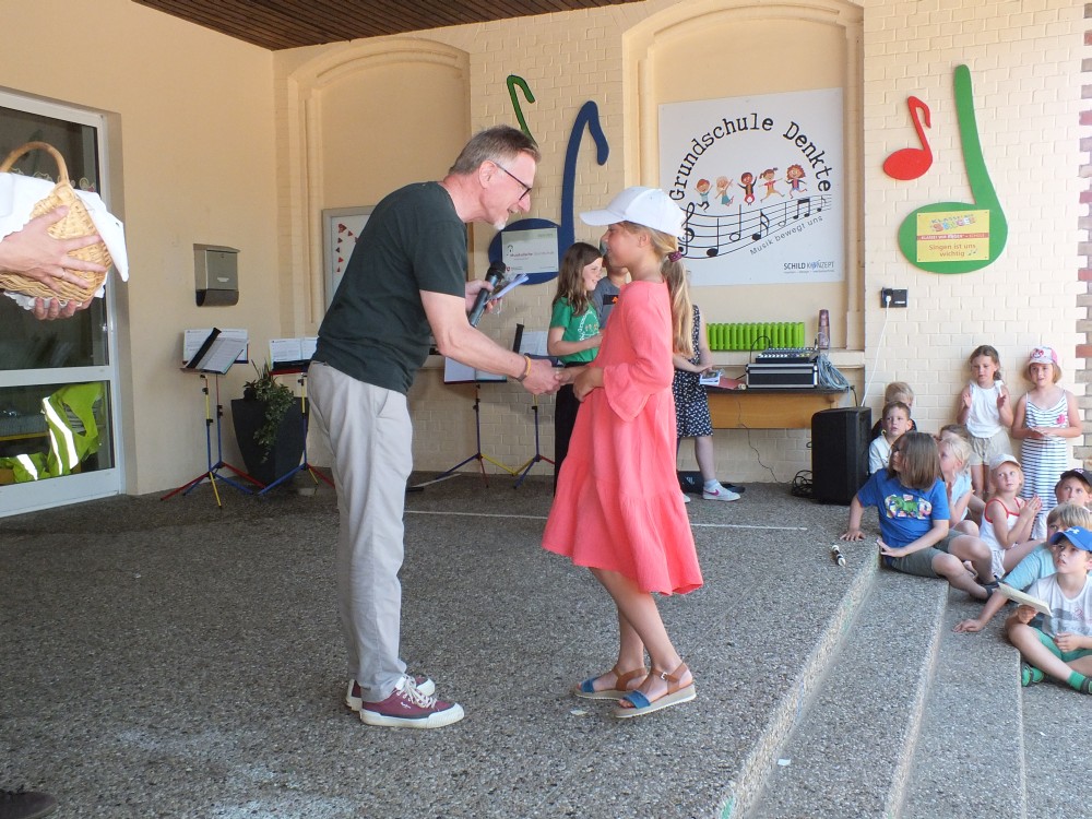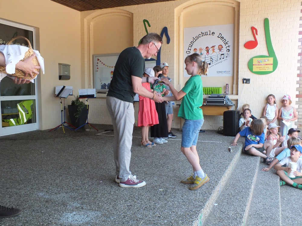 Zum Schluss wurde Herr Böckmann in seinen wohlverdienten Ruhestand verabschiedet. Mit zu Herzen gehenden Liedern und Geschenken vom Kollegium, dem Schulverein, Schülerinnen und Schülern und deren Eltern wurde ihm für seine Verdienste an der Grundschule Denkte gedankt.