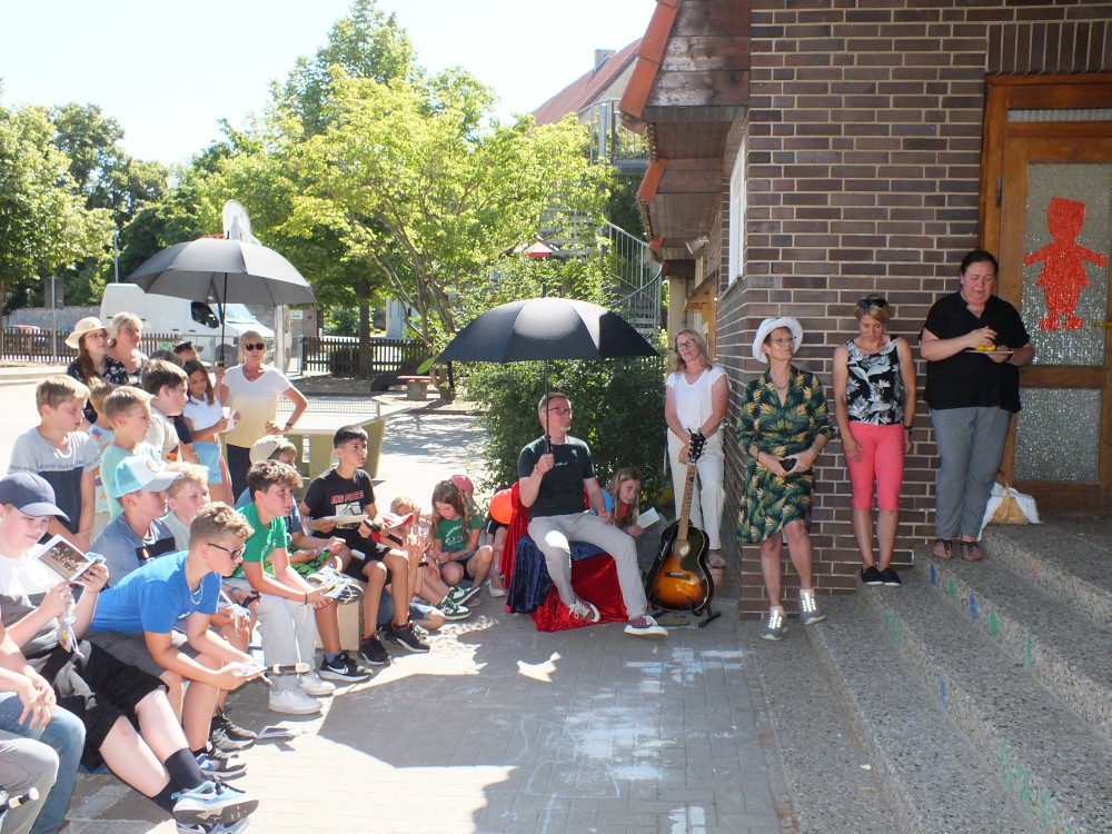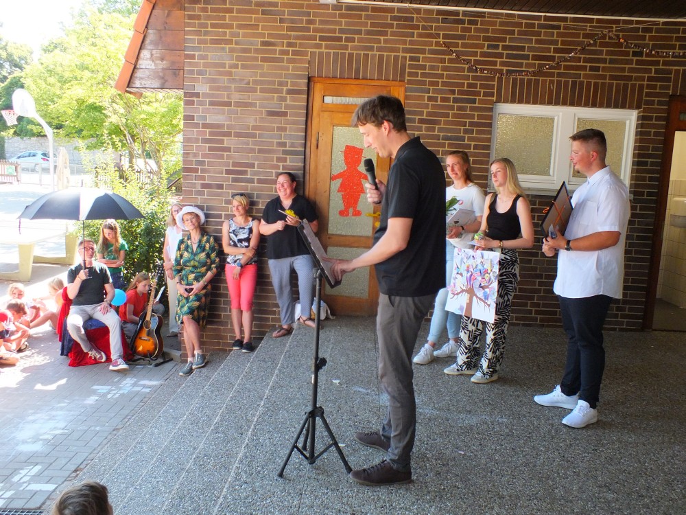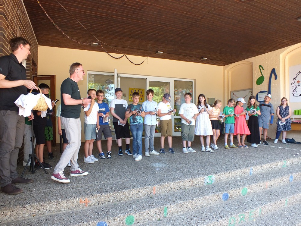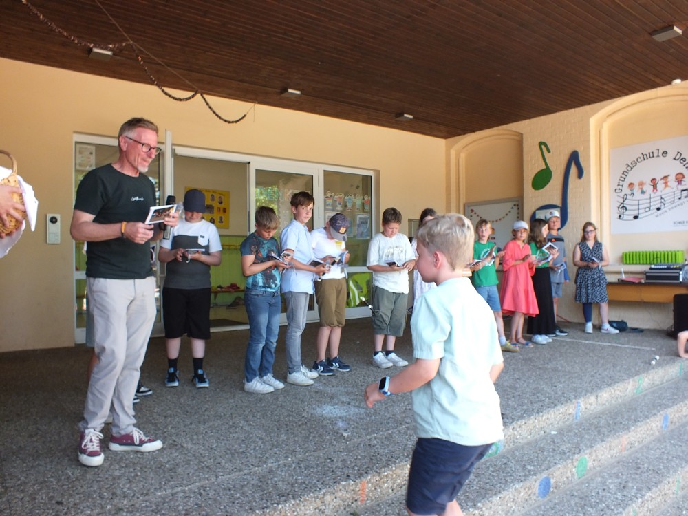 Anschließend verabschiedete sich die 4. Klasse mit einigen musikalischen Beiträgen. Ihr Klassenlehrer Herr Böckmann übereichte jedem ein kleines Abschiedsgeschenk.